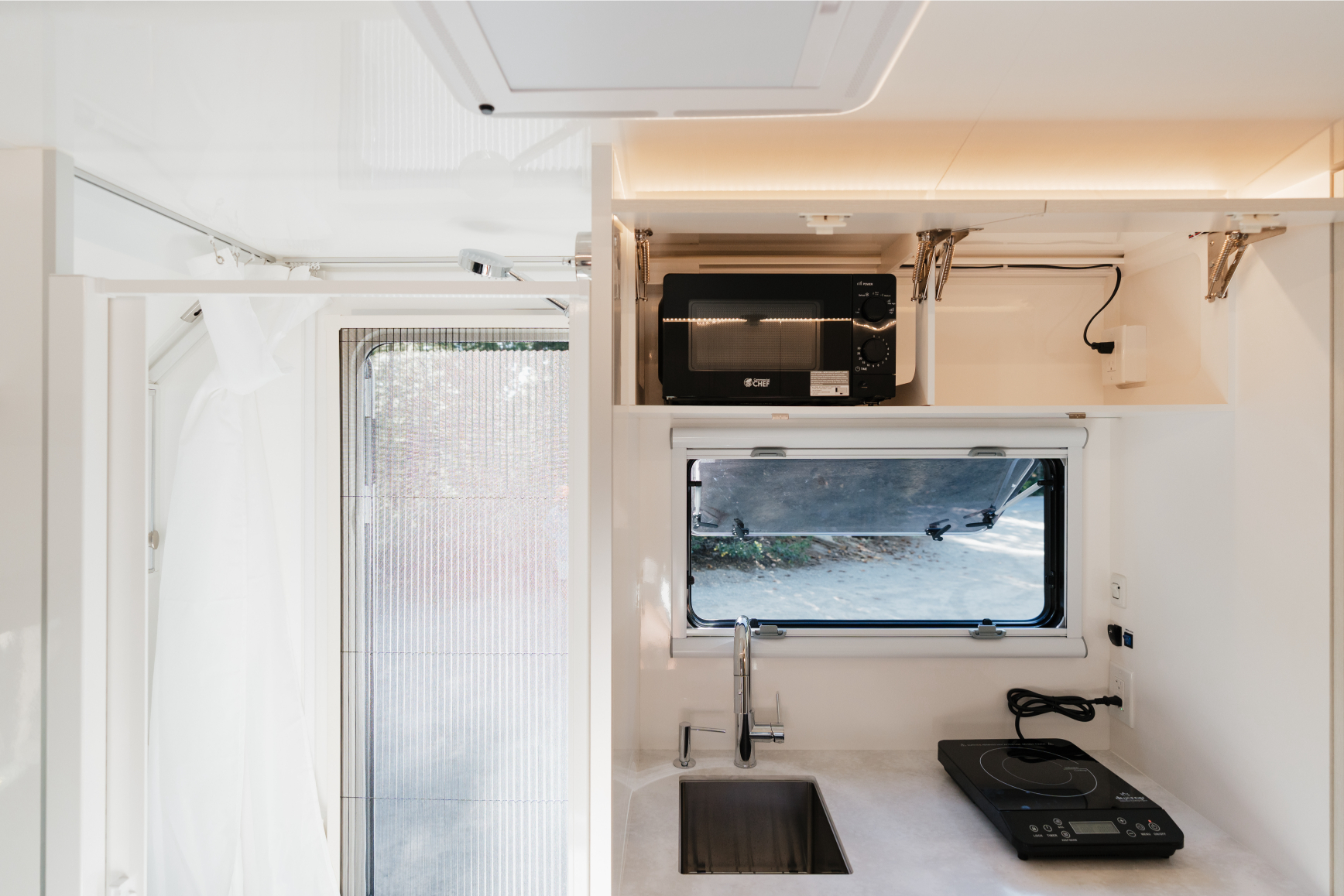 - Inside/outside shower, cassette or composting toilet
