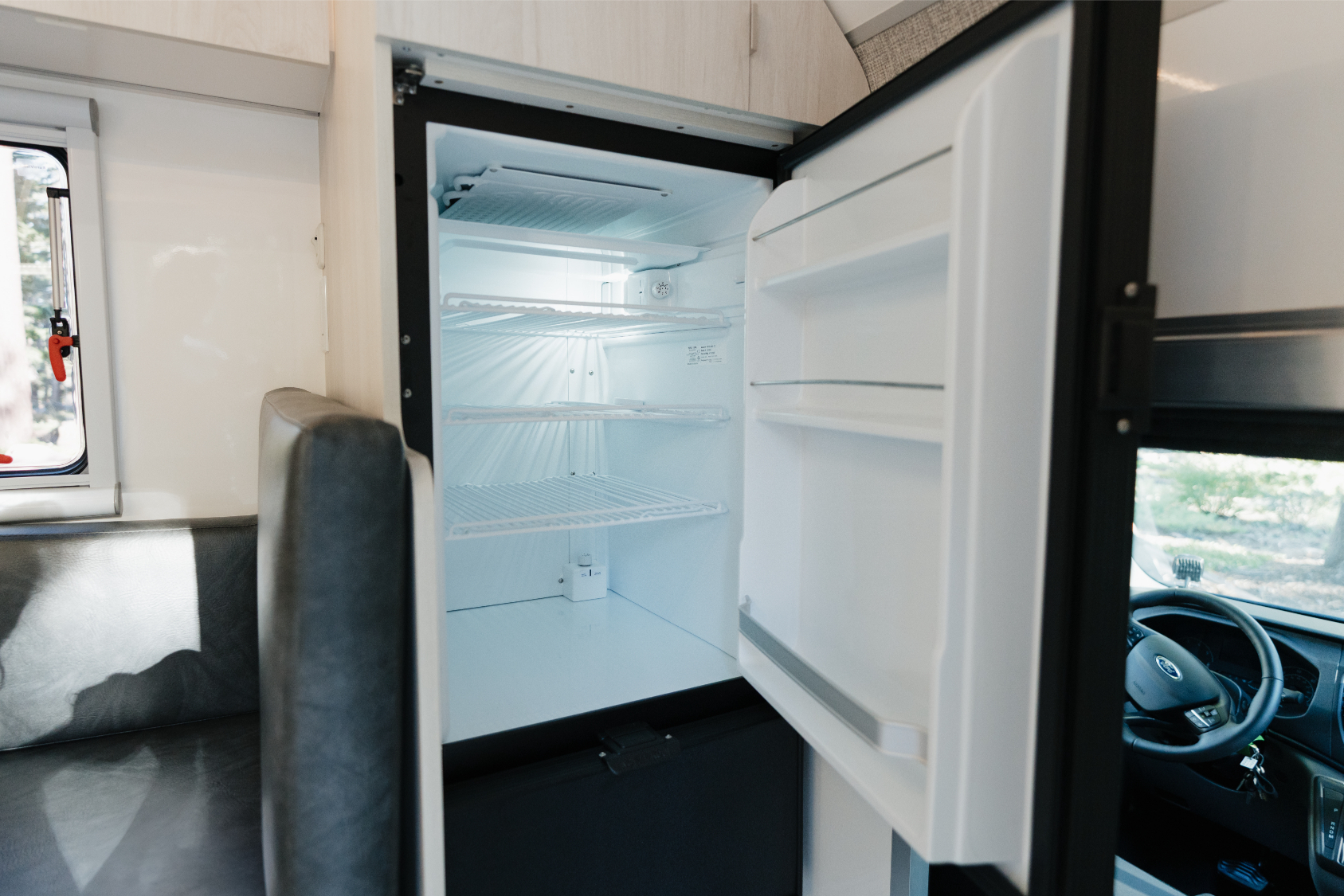The interior uses modern European style cabinetry, a functional kitchen layout, natural light, and a private sleeping area. It’s designed for durability and comfort whether traveling on weekends or long adventures.
